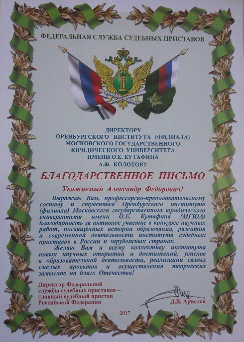 Директор Федеральной службы судебных приставов – главный судебный пристав Российской Федерации Д.В. Аристов выражает благодарность директору института А.Ф. Колотову, профессорско-преподавательскому составу и студентам за активное участие в конкурсе научных работ, желает новых научных открытий и достижений, успехов в образовательной деятельности, реализации смелых проектов и осуществления творческих замыслов на благо Отечества.