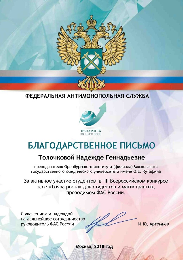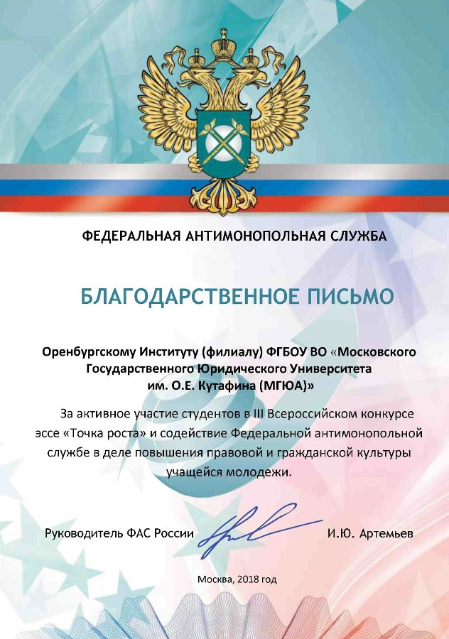 Федеральная антимонопольная служба (ФАС России) выражает благодарность Оренбургскому институту (филиалу) Университета имени О.Е. Кутафина (МГЮА) за активное участие студентов вуза в III Всероссийском конкурсе эссе «Точка роста» для студентов и магистрантов, который прошел в 2017-2018 гг.