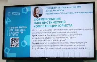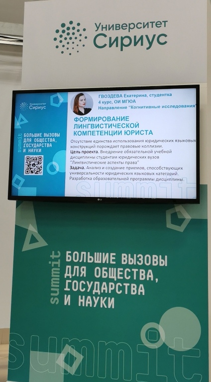 В работе саммита приняла участие студентка 4 курса Оренбургского института (филиала) Университета имени О.Е. Кутафина (МГЮА)Гвоздева Екатерина, прошедшая конкурсный отбор по направлению "Когнитивные исследования" с научно-исследовательским проектом "Формирование лингвистической компетенции юриста путем внедрения обязательной учебной дисциплины "Лингвистические аспекты права".