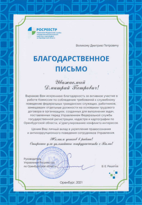 Управление Федеральной службы государственной регистрации, кадастра и картографии по Оренбургской области выражает благодарность заместителю директора по учебной работе Д.П.Великому за личный вклад в укрепление правосознания и антикоррупционного поведения сотрудников Управления.