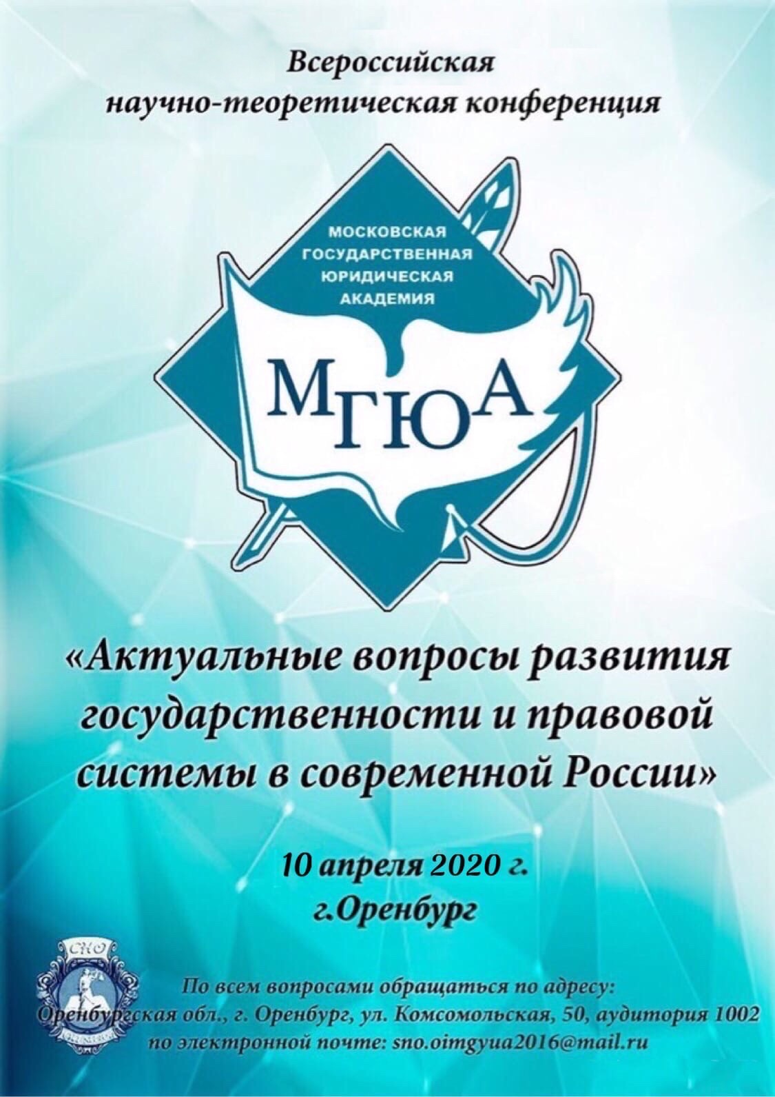 XXVIII Всероссийская студенческая конференция "АКТУАЛЬНЫЕ ВОПРОСЫ РАЗВИТИЯ ГОСУДАРСТВЕННОСТИ И ПРАВОВОЙ СИСТЕМЫ В СОВРЕМЕННОЙ РОССИИ" посвящается